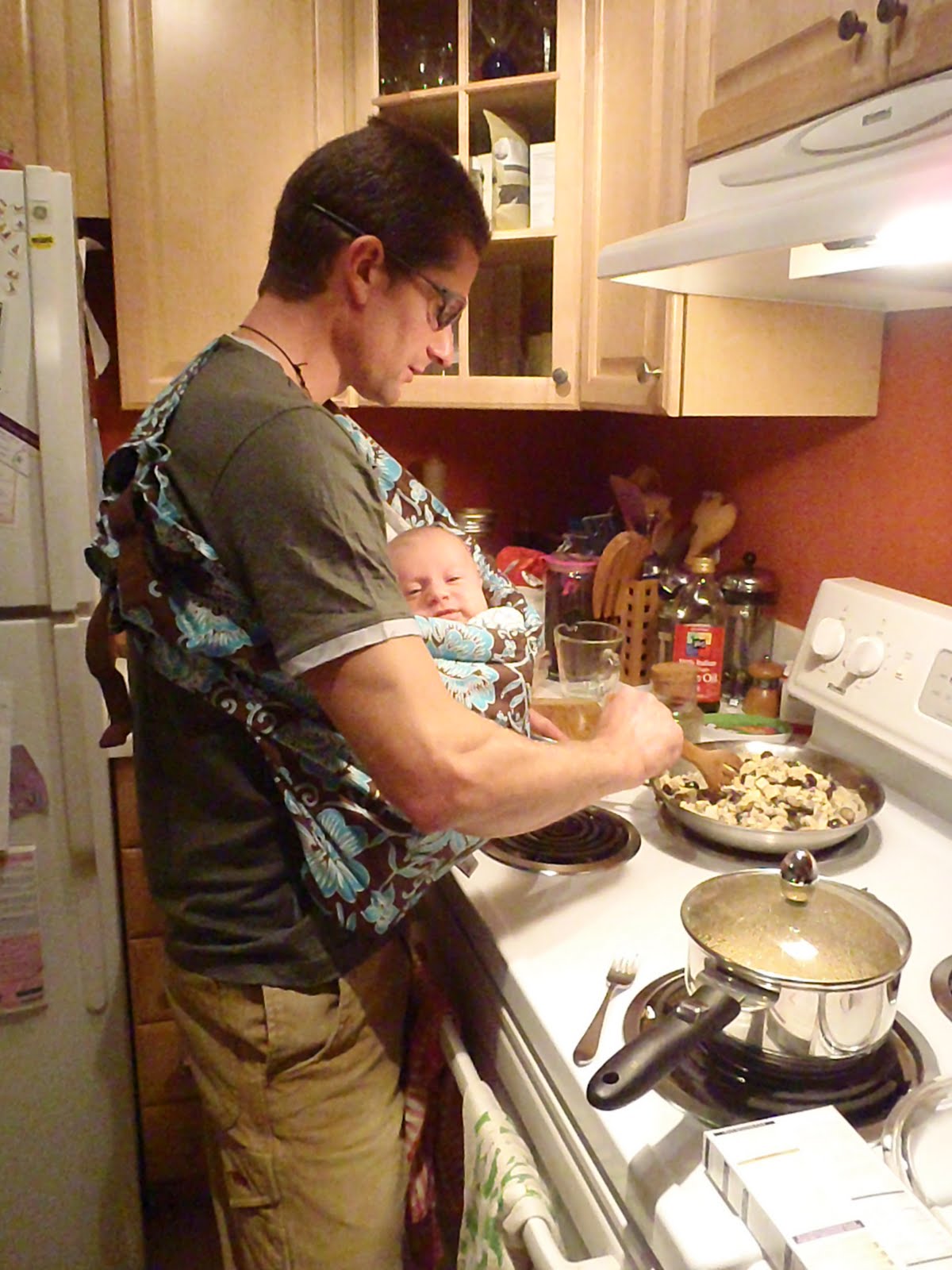 That's it... it feels like winter is just around the corner! No snow yet, but it has gotten a lot colder. We thus had to bundle our little man with (one of) the awesome little jackets Minnie knitted for Sky. He looks like a little sheep in it and looks really warm and comfy!! We're getting used to carrying him around the house in the sling. "Wear your baby" is big these days... he loves it, and we do too!!! He is a lot more interactive already, looking around a bunch and smiling once in a while :))